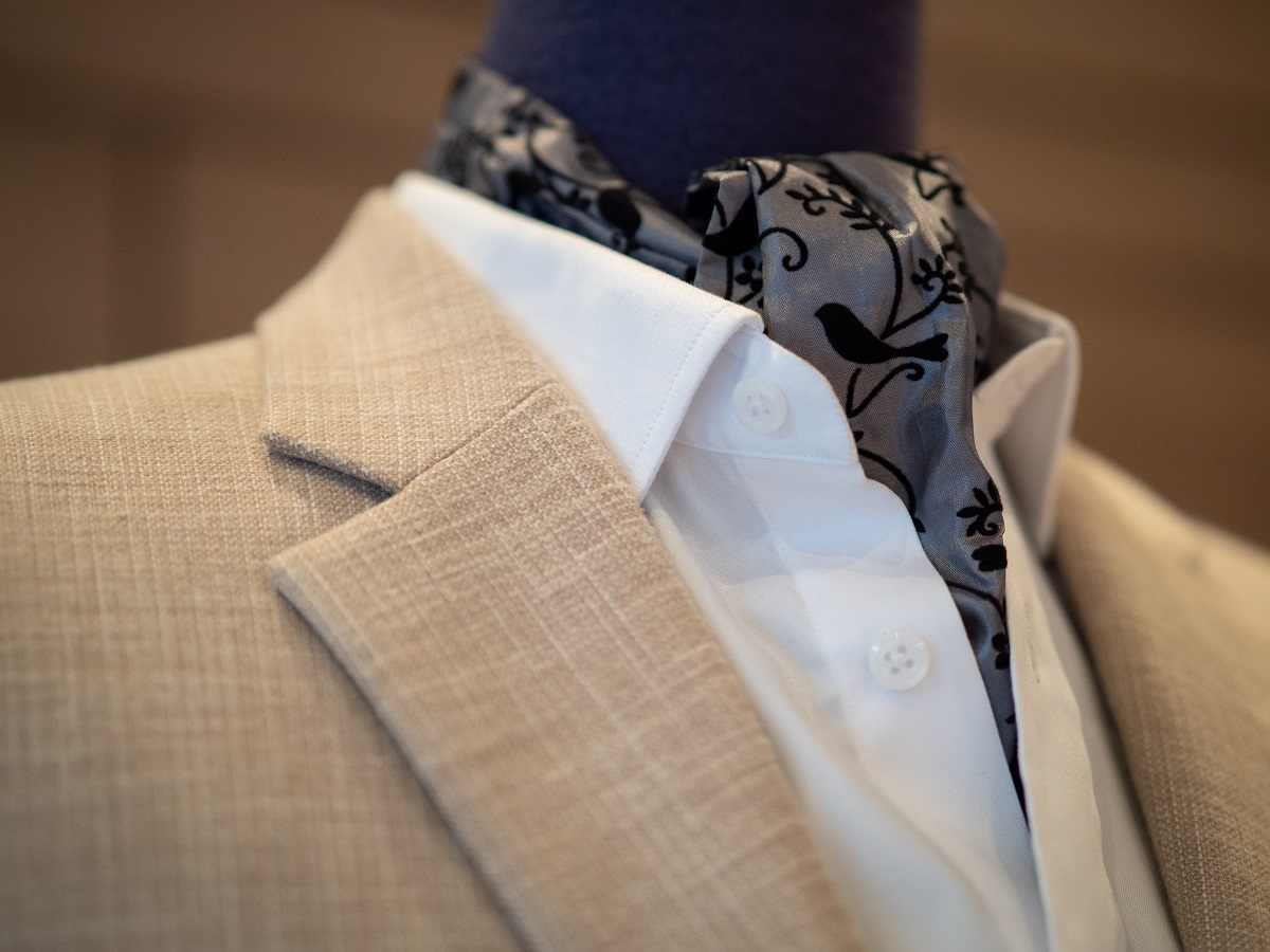 Ascot : L'ascot est un foulard élégant qui est noué autour du cou et porté avec une chemise habillée. Il ajoute une touche de sophistication et de formalité à une tenue de mariage. Les ascots sont souvent portés avec des gilets assortis pour un look plus complet.