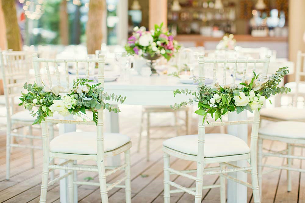Les compositions florales sont les grandes célébrités de la décoration nuptiale et pour cause : Elles peuvent apporter une touche de romantisme à n’importe quel lieu ou objet ! Alors pourquoi ne pas les utiliser sur vos chaises ? Roses, gypsophiles ou eucalyptus, les possibilités sont nombreuses pour sublimer votre mobilier.