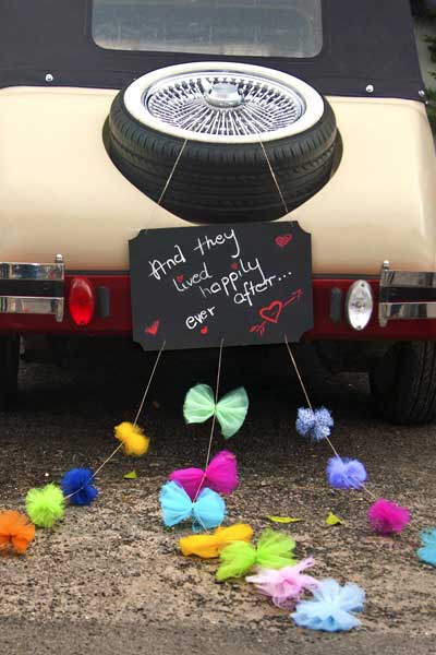 Mais les tendances déco évoluent vers des horizons plus naturels, où la toile de jute se marient avec la dentelle, les marguerites et les coquelicots se parent de leur plus beaux atours. C’est un retour vers une ambiance simple et conceptuelle, un style « guinguette », « champêtre chic » avec fanions, carreaux de Vichy, guirlande lumineuse d’extérieur et lampions de papier, décor de fleurs des champs. Ce style de décoration se retrouve aussi dans les accessoires de voiture de cérémonie, avec une très jolie guirlande « just married », faite de petits fanions de toile de jute avec l’inscription en typographie vintage ; idéale pour parfaire la décoration de votre mariage dans ce thème. Ajoutez quelques fleurs de marguerite collées sur les parties vitrées de la voiture, le thème est en tout point respecté.