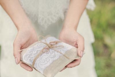 Un coussin d'alliances en toile de jute et dentelle
