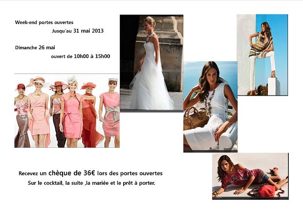 C'est pourquoi jusqu'au 31 mai, recevez lors de vos achats sur le prêt à porter, le cocktail ou la commande de votre robe de mariée, un chèque cadeau de 36 €.