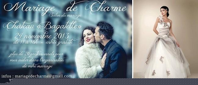 En tant que partenaire du salon du mariage qui aura lieu le 24 novembre2013 au Château Bagatelle, la boutique Mariage de Charme vous offre plusieurs lots.