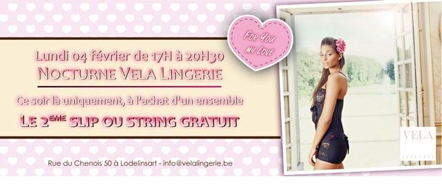 L'action 'For you my love' : pour un ensemble acheté, recevez un 2ième slip (ou string) gratuit uniquement lors de la nocture Vela Lingerie, le Lundi 4 Février de 10h à 20h30.