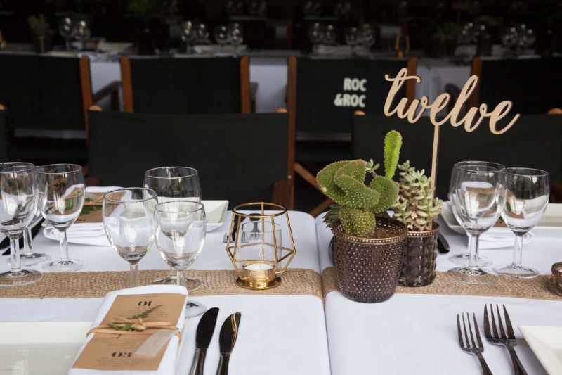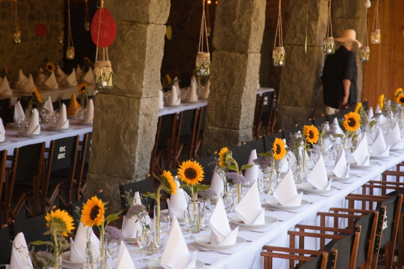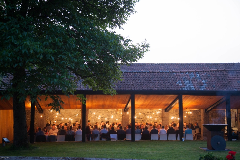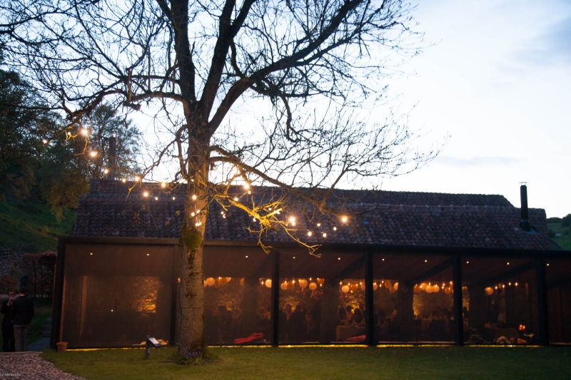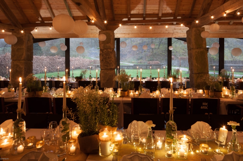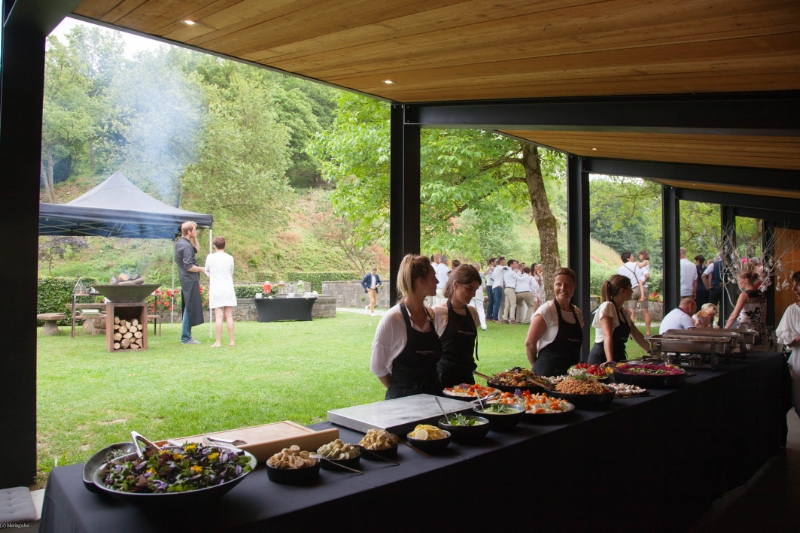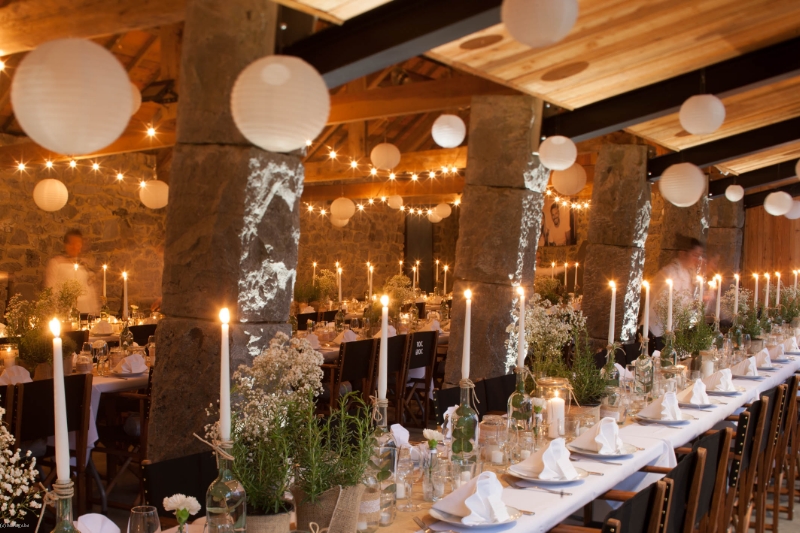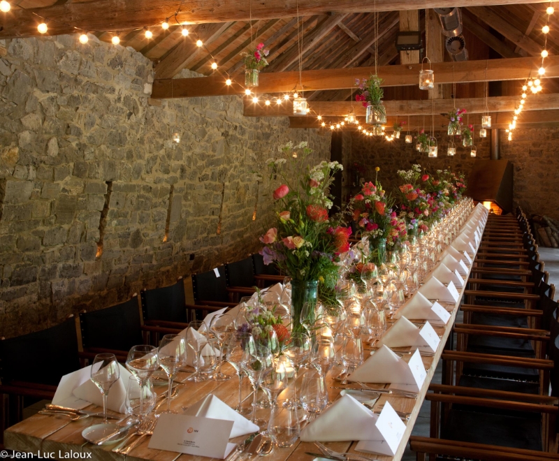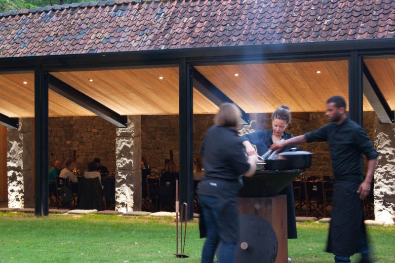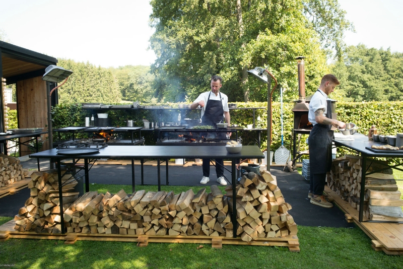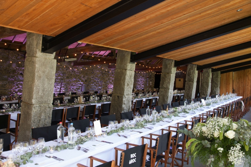 Cuisine professionnelle, bar, feu ouvert, enceintes audio, tables rectangulaires et chaises pour 120 personnes.